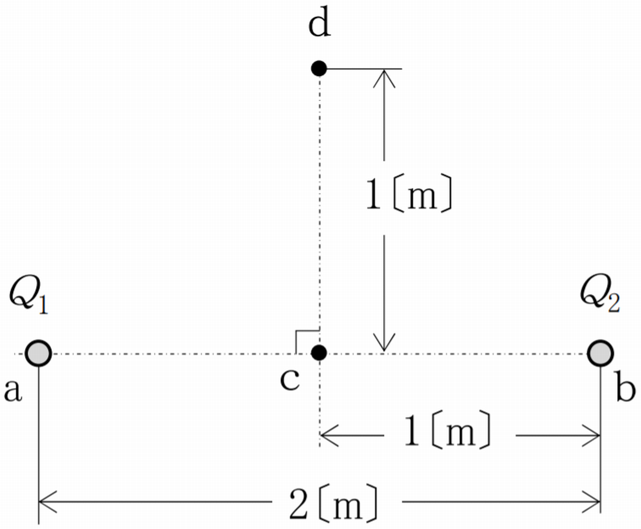 図に示すように、真空中で 2〔m〕離れた点 a 及びbにそれぞれ点電荷 Q 1 = 4×
