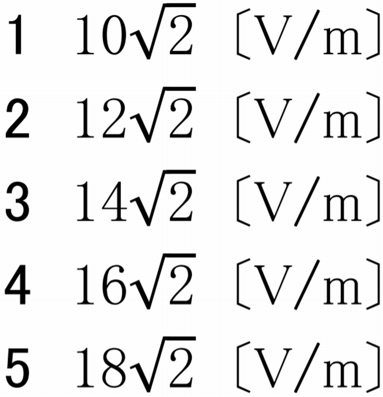 〔C〕が置かれているとき、 線分 ab の中点cと、c から線分 ab に垂直方向に 1〔m〕離れた点dの電界の強さの値として、正しいものを下の番号から選べ。ただし、真空の誘電率を ε0〔F/m〕としたとき、1/(4πε0) = 9×